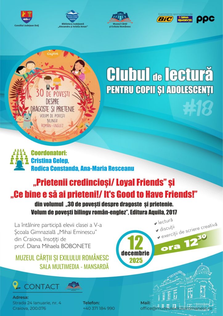 Muzeul Cărții și Exilului Românesc organizează vineri, 12 decembrie 2025, la ora 12.30, cea de-a optsprezecea întâlnire din cadrul Clubului de lectură pentru copii și adolescenți, care se va desfășura în limba engleză. La întâlnire vor participa elevii clasei a V-a, însoțiți de profesor de limba engleză Diana Mihaela Bobonete, de la Școala Gimnazială „Mihai