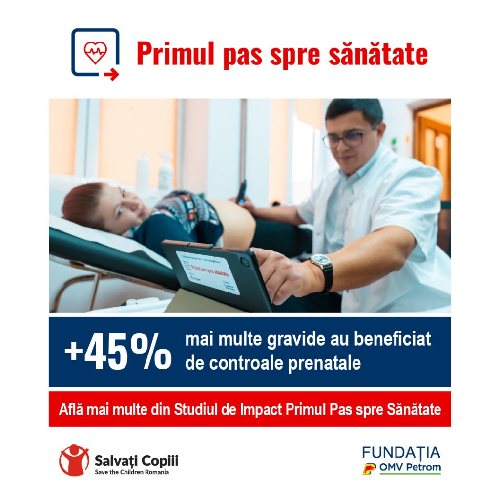 Programul „Primul pas spre sănătate”, implementat de Salvați Copiii România și finanțat de Fundația OMV Petrom, reprezintă cea mai amplă investiție din România în susținerea sănătății timpurii pentru viitoarele mame și nou-născuți, prin intermediul medicinei de familie, în zonele rurale defavorizate. În cei doi ani de implementare, 23.900 de mame și 30.380 de copii cu vârsta