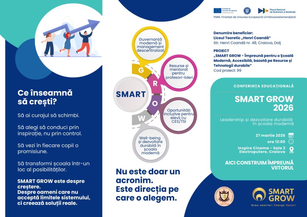 Liceul Teoretic „Henri Coandă” din Craiova organizează vineri, 27 martie 2026, ora 12:00, la Inspire Cinema Electroputere, conferința educațională „SMART GROW 2026”, dedicată prezentării implementării proiectului pilot „SMART GROW – Împreună pentru o Școală Modernă, Accesibilă, bazată pe Resurse și Tehnologii durabile”, Cod proiect: 99. Finanțat prin Planul Național de Redresare și Reziliență, proiectul poziționează