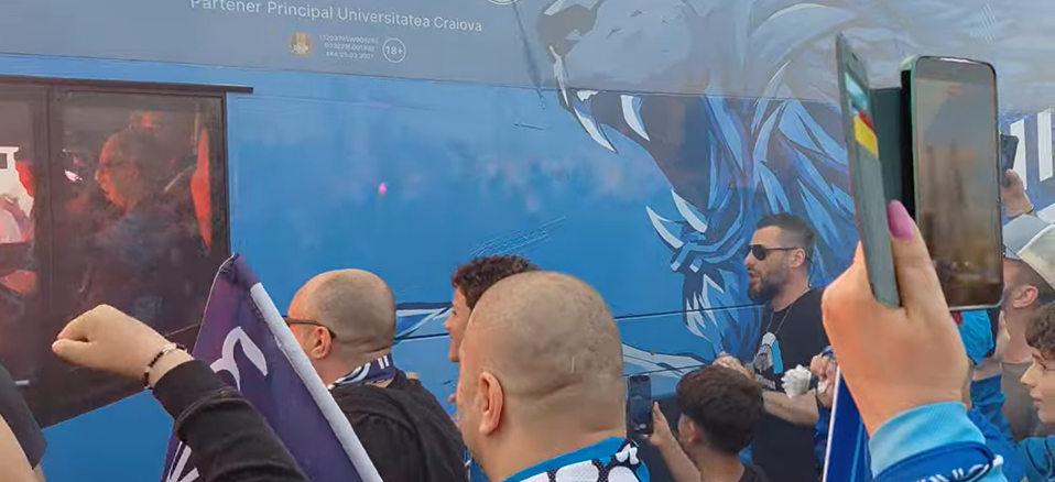 Câteva mii de fani au așteptat autocarul jucătorilor de la Universitatea Craiova în zona Stadionului „Ion Oblemenco”. Echipa fanion a Olteniei joacă, în prezența a 23.234 suporteri, în această seară de la orele 21,00 împotriva giuleștenilor într-o partidă ce contează pentru Etapa 5 din playoff-ul campionatului. UNIVERSITATEA CRAIOVA TITULARI: 21 Iulian Laurentiu POPESCU, 17 Carlos