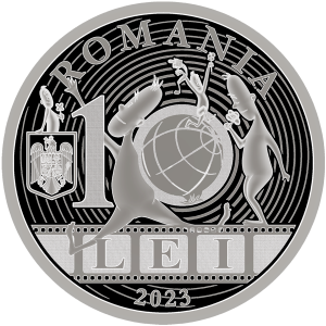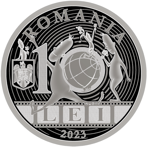 Aversul monedei redă personajul de animație creat de Ion Popescu-Gopo (Omulețul) reprezentat în mai multe ipostaze, alături de globul pământesc și o peliculă de film, inscripția „ROMANIA” în arc de cerc, stema României, valoarea nominală „10 LEI” și anul de emisiune „2023”.