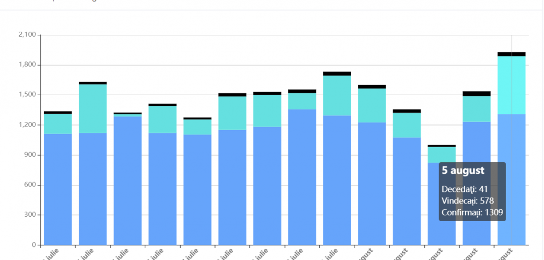 În intervalul 04.08.2020 (10:00) – 05.08.2020 (10:00) au fost înregistrate 41 de decese (28 bărbați și 13 femei), ale unor pacienți infectați cu noul coronavirus, internați în spitalele din Arad, Argeș, Bacău, Bihor, Botoșani, Brăila, Brașov, Călărași, Caraș-Severin, Cluj, Dâmbovița, Galați, Gorj, Harghita, Hunedoara, Ialomița, Iași, Neamț, Olt, Suceava, Timiș, Tulcea, Vaslui și Municipiul București.