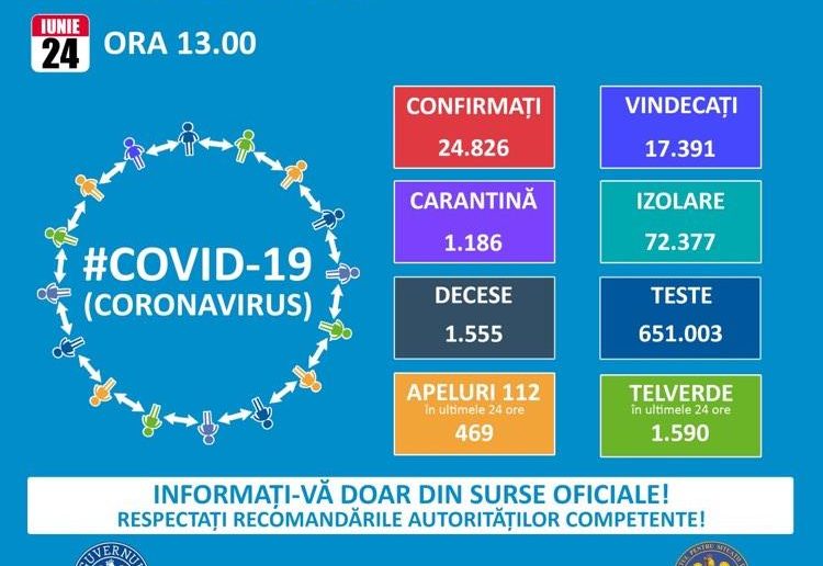 Până astăzi, 24 iunie, pe teritoriul României, au fost confirmate 24.826 cazuri de persoane infectate cu virusul COVID – 19 (). Dintre persoanele confirmate pozitiv, 17.391 au fost declarate vindecate și externate.