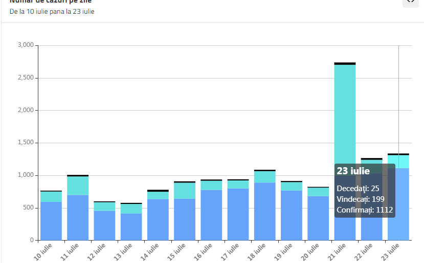 În intervalul 22.07.2020 (10:00) – 23.07.2020 (10:00) au fost înregistrate 25 de decese ( 16 bărbați și 9 femei), ale unor pacienți infectați cu noul coronavirus, internați în spitalele din Argeș, Bacău, Călărași, Dâmbovița, Galați, Ialomița, Maramureș, Mehedinți, Prahova, Sibiu, Vaslui, Vrancea și București.