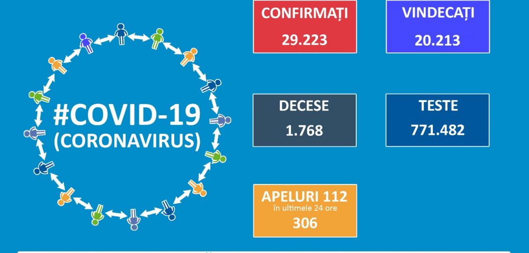 Până astăzi, 6 iulie, pe teritoriul României, au fost confirmate 29.223 de cazuri de persoane infectate cu noul coronavirus (COVID – 19). Dintre persoanele confirmate pozitiv, 21.413 au fost externate, dintre care 20.213 de pacienți vindecați și 1.200 de pacienți asimptomatici, externați la 10 zile după depistare.