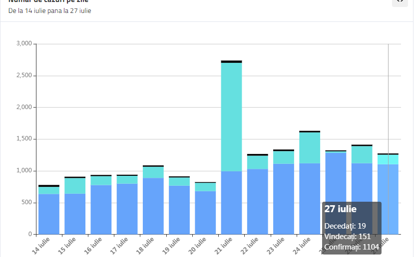 În intervalul 26.07.2020 (10:00) – 27.07.2020 (10:00) au fost înregistrate 19 de decese (11 bărbați și 8 femei), ale unor pacienți infectați cu noul coronavirus, internați în spitalele din Bacău, Botoșani, Brăila, Brașov, Buzău, Călărași, Caraș-Severin, Galați, Iași, Maramureș, Mehedinți, Prahova, Sibiu.
