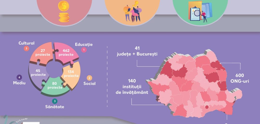 În total, 600 de ONG-uri, 140 de instituții de învățământ și 8 grupuri informale au beneficiat de sprijin financiar pentru a derula proiecte cu impact pozitiv în domeniile educație, sănătate, social, mediu și cultură. Aceste proiecte au avut un impact direct asupra vieților a milioane de români din toate județele țării, demonstrând ce înseamnă puterea solidarității și colaborării în construirea unui viitor mai bun.
