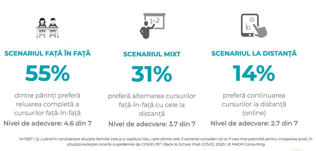 Pentru revenirea la cursuri în această toamnă, majoritatea părinților români preferă scenariul cursurilor față în față, pe care îl consideră cel mai potrivit. Mai exact, 55% dintre părinții care au răspuns studiului preferă revenirea fizică a elevilor în clase din 14 septembrie. Cursurile față în față sunt preferate, mai ales, în cazul preșcolarilor și elevilor de liceu.