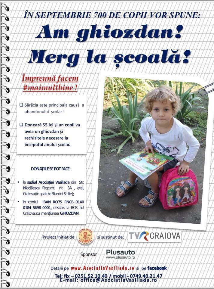 700 de copii din județele Dolj și Gorj, majoritatea din mediul rural, vor primi ghiozdane cu rechizite școlare, în cadrul campaniei sociale „Am ghiozdan! Merg la școală”. Campania a fost inițiată de Asociația Vasiliada, aflată sub patronajul Mitropoliei Olteniei.