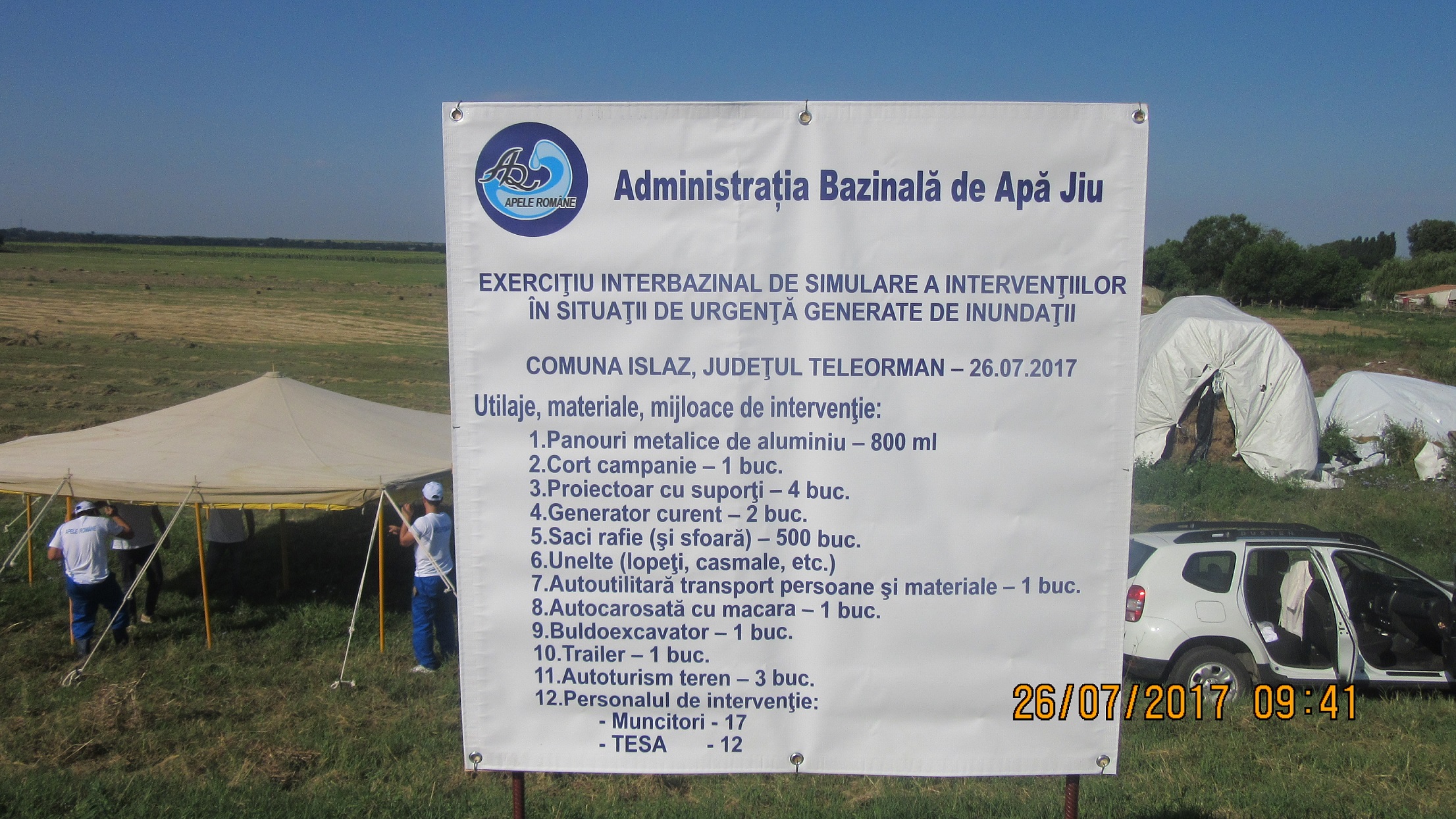 După luarea în primire a sectoarelor de dig, începând cu data de 25.07.2017 – ora 13.00, echipele de intervenție ale A.B.A Jiu, A.B.A Olt, A.B.A Argeș Vedea și A.B.A Buzău Ialomița au început acțiunile de descărcare a echipamentelor, amplasarea corturilor și a turnurilor de iluminat, a hidrobarajelor, panourilor de aluminiu, etc.