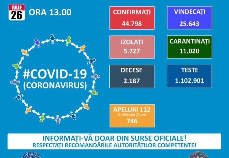 Până astăzi, 26 iulie, pe teritoriul României, au fost confirmate 44.798 de cazuri de persoane infectate cu noul coronavirus (COVID – 19).