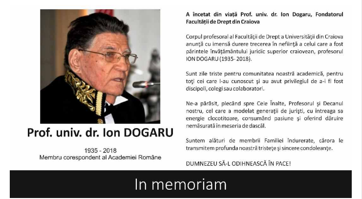 Ion Dogaru, fondatorul Facultății de Drept a Universității din Craiova, a decedat astăzi, la 83 ani. Acesta a fost membru corespondent al Academiei Române, cercetător prolific în domeniul dreptului, creator al unei opere vaste și diverse, care se bucură de o largă recunoaștere internă și internațională. La sfârșitul lunii ianuarie a acestio an, Dogaru și-a donat, fondul de carte, Universității din Craiova. La eveniment au fost prezenți oaspeți deosebiți din țară sau de peste hotare: Victor Spinei, vicepreședintele Academiei Române, Ion Gugeac, vicepreședintele Academiei de Științe din Republica Moldova, dar și Bogdan Cuza, doctor în economie, descendent al marelui Domnitor Alexandru Ioan Cuza. „Fondul de carte Ion Dogaru reuneste peste 4.500 de lucrări de specialitate, donate Universității din Craiova și Facultății de Drept. Unele dintre acestea sunt veritabile bijuterii ale Doctrinei Juridice Europene”, a precizat Sevastian Cercel, Decanul Facultații de Drept. Acest fond a fost constituit cu sprijinul conducerii Universității. În urma cu trei ani, profesorului craiovean i-a fost dedicat volumul omagial „O viață dedicată dreptului”, publicat de colaboratorii profesorului Ion Dogaru.