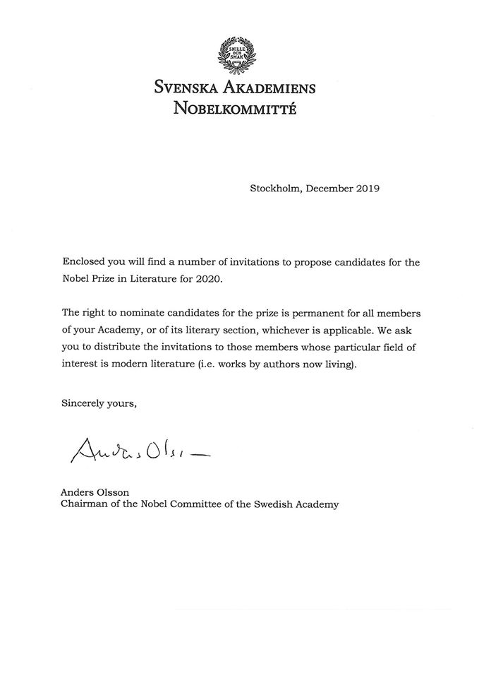 „Domnul Anders Olsson, președintele Comitetului Nobel al Academiei Suedeze, ne-a adresat invitația de a face propuneri pentru acordarea Premiului Nobel pentru Literatură pe anul 2020. Academia Internațională Mihai Eminescu este singura instituție din România care are onoarea de a trimite Comitetului Nobel din cadrul Academiei Suedeze nominalizări, în fiecare an, contribuind astfel la acordarea celei mai importante distincții pentru literatură în plan mondial”, se arată într-un comunicat publicate pe o rețea de socializare.