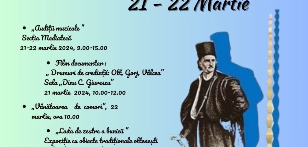 Fiecare dintre secțiile Bibliotecii Județene „Alexandru și Aristia Aman” a pregătit pentru joi, 21 martie, și vineri, 22 martie, evenimente menite să amintească despre valorile culturale și tradiționale ale Olteniei, precum: expoziții, lansări de carte, expoziții de pictură, concurs de desene, vizionări de film, audiții muzicale și multe alte activități.