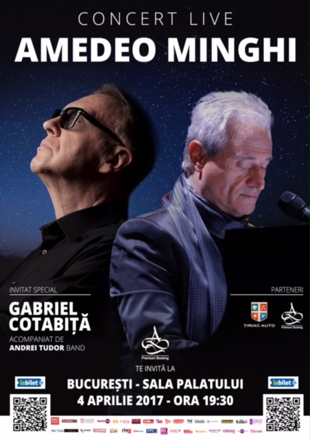 AMEDEO MINGHI, cantautorul italian de mare succes, a cărui personalitate puternică, modelată simultan de acea sensibilitate aparte, întâlnită în compoziţiile romantice și în maniera interpretativă caldă, va da glas ideilor muzicale adunate de-a lungul celor 50 de ani de activitate artistică, în primul său concert pe scena Sălii Palatului din București, ce va avea loc pe 4 aprilie 2017, începând cu ora 19:30.