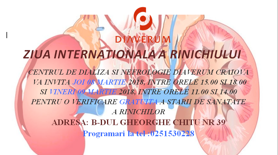 In 2018, Ziua Mondială a Rinichiului este marcată pe 8 Martie pentru a sublinia importanța sănătății femeilor în general, și a sănătății rinichilor, în special. Ziua Mondială a Rinichiului, ajunsă in 2018 la a 13-a aniversare, promovează accesul egal la educație și servicii medicale pentru femeile din întreaga lume. Astfel, în Centrul de Dializă și Nefrologie Diaverum Craiova se organizează ZIUA PORTILOR DESCHISE. În acest sens, in zilele de 8 si 9 martie se oferă examinare gratuită (screening) în vederea depistării precoce a bolilor renale in sediul Diaverum Craiova din strada Gheorghe Chitu nr 39. Programarile se vor face la nr de telefon 0251 530 228.