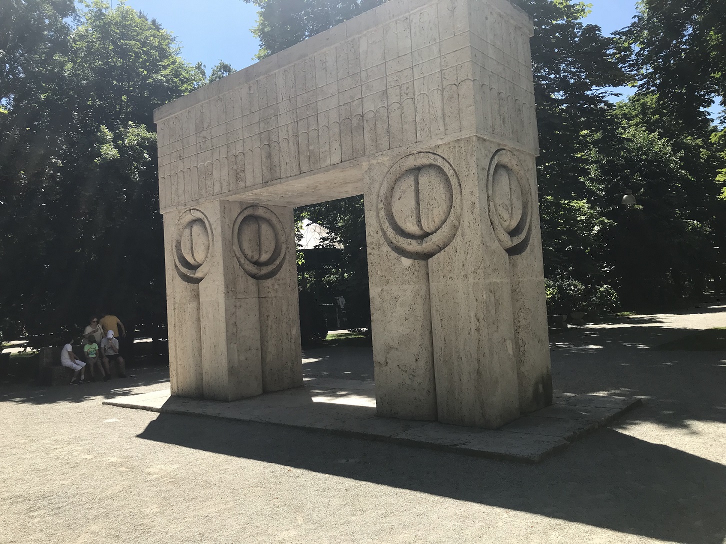 Stâlpii „Coloanei sărutului” prezintă multiplicat simbolul ochilor îngemănaţi iar arhitrava „Porţii sărutului” reproduce, incizat de patruzeci de ori ”Sărutul” din Montparnasse, sugerând o horă.