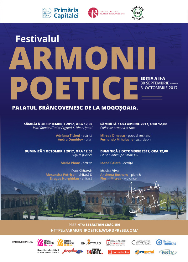 Primăria Municipiului București, prin Centrul Cultural Palatele Brâncovenești și Asociația Culturală ‘Pro Valores’ readuc marea poezie și muzica de calitate în spațiul deosebit de ofertant al Palatului Brâncovenesc de la Mogoșoaia.