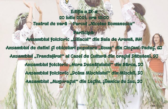 Consiliul Judeţean Dolj şi Centrul Judeţean pentru Conservarea şi Promovarea Culturii Tradiţionale Dolj, în parteneriat cu Opera Română Craiova și cu sprijinul Primăriei şi al Consiliului Local Municipal Craiova, organizează marți, 20 iulie 2021, cu începere de la ora 18:00, Festivalul de datini şi obiceiuri „Tradiţiile verii“, ediţia a IX-a, la Teatrul de vară din Parcul „Nicolae Romanescu“. Ansambluri din judeţele Dolj, Gorj, Mehedinți vor prezenta obiceiuri de vară din lumea satului, ca: Sânzienele sau Drăgaica, Paparudele, Muma Ploii. Participă ansamblurile folclorice: „Liliacul“ din Baia de Aramă – Mehedinţi, „Roua“…