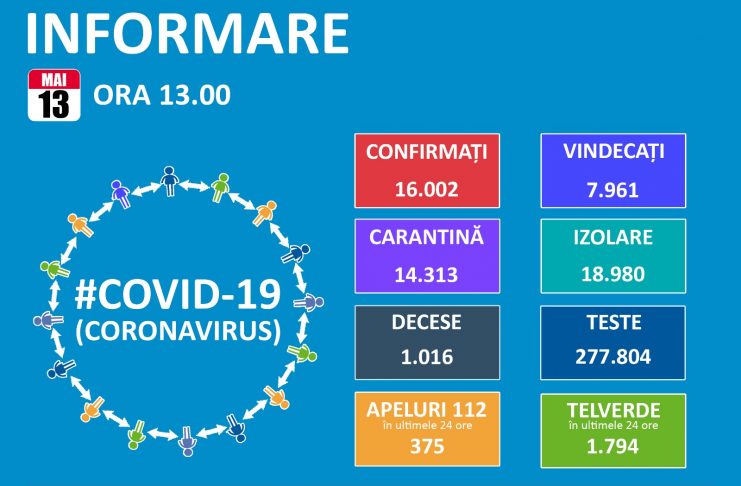 Până astăzi, 16 mai, pe teritoriul României, au fost confirmate 16.704 de cazuri de persoane infectate cu virusul COVID – 19 (coronavirus). Dintre persoaneleconfirmate pozitiv, 9.574 au fost declarate vindecate și externate. Numărul de cazuri confirmate, pe județe, potrivit raportării Institutului Național de Sănătate Publică: Nr. crt. Județ Număr de cazuri confirmate 1. Alba 265 2. Arad 691 3. Argeș 199 4. Bacău 427 5. Bihor 501 6. Bistrița-Năsăud 300 7. Botoșani 655 8. Brașov 613 9. Brăila 20 10. Buzău 104 11. Caraș-Severin 110 12. Călărași 69 13. Cluj…