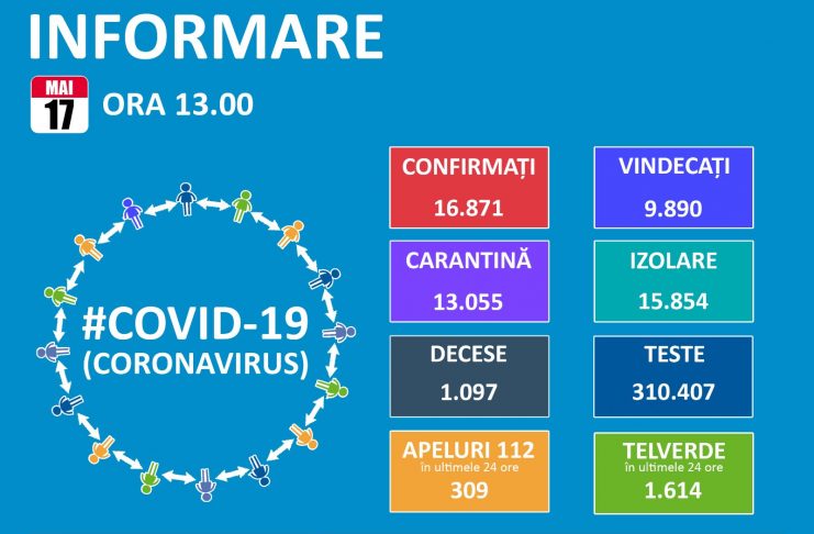 Până astăzi, 17 mai, pe teritoriul României, au fost confirmate 16.871 de cazuri de persoane infectate cu virusul COVID – 19 (coronavirus). Dintre persoanele confirmate pozitiv, 9.890 au fost declarate vindecate și externate. Numărul de cazuri confirmate, pe județe, potrivit raportării Institutului Național de Sănătate Publică: Nr. crt. Județ Număr de cazuri confirmate 1. Alba 265 2. Arad 696 3. Argeș 210 4. Bacău 431 5. Bihor 501 6. Bistrița-Năsăud 301 7. Botoșani 659 8. Brașov 616 9. Brăila 20 10. Buzău 105 11. Caraș-Severin 110 12. Călărași 73 13.…