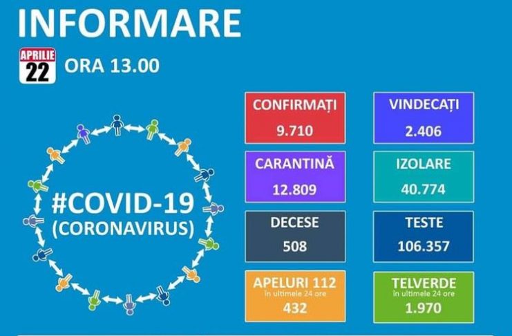 De la intrarea în vigoare a Ordonanței Militare nr. 2 și până în prezent, au fost plasate în carantină instituționalizată 2.172 de persoane care nu au respectat perioada de autoizolare. De asemenea, 135 de persoane aflate în carantină au părăsit locația în care au fost plasate, pentru acestea fiind dispusă măsura carantinării pentru o nouă perioadă de 14 zile. Până astăzi, 22 aprilie, pe teritoriul României, au fost confirmate 9.710 de cazuri de persoane infectate cu virusul COVID – 19 (coronavirus). Dintre persoanele confirmate pozitiv, 2.406 au fost declarate vindecate și externate.…