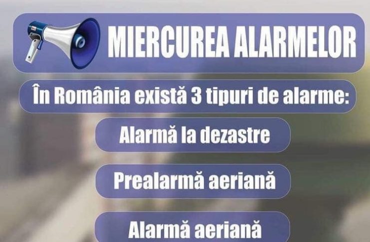 Astăzi, începând cu ora 10.00, va avea loc un nou exercițiu “Miercurea Alarmelor”. Sirenele din țară vor emite semnalul „Prealarmă aeriană”, care are rolul de prevenire a populației civile asupra apariția pericolului. În România există 3 tipuri de alarme: ð¢ Alarmă la Dezastre (5 sunete) ð¢ Prealarmă Aeriană (3 sunete) ð¢ Alarmă Aeriană (15 sunete) Prin modul de acționare a mijloacelor tehnice de alarmare există posibilitatea de a crea disconfort în spațiul public, motiv pentru care vă asigurăm că astfel de exerciții periodice sunt necesare și benefice. #POMPIERII #IGSU #SMURD #ProtecțieCivilă…