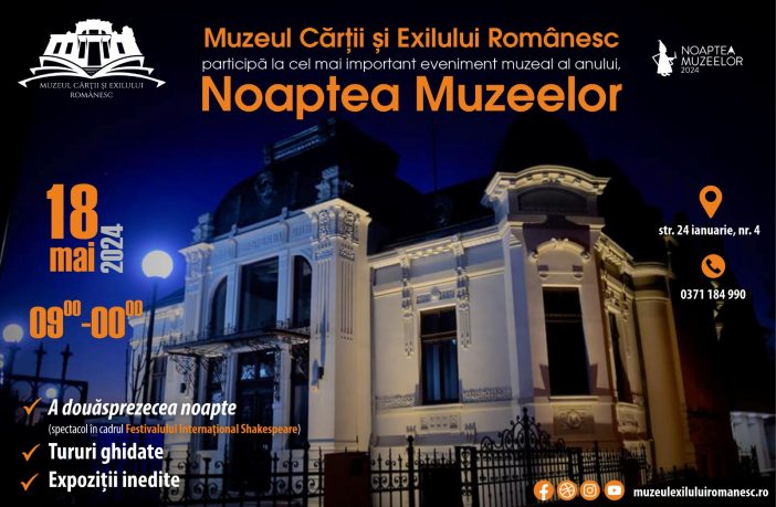 Muzeul Cărții și Exilului Românesc anunță că în ziua de 18 mai 2024, participă la cel mai important eveniment muzeal al anului, Noaptea Muzeelor. Toți cei care doresc să viziteze Muzeul Cărții și Exilului Românesc sunt așteptați până la miezul nopții cu tururi ghidate, spectacole de teatru, expoziții inedite ce conțin documente, fotografii, obiecte de artă din cele peste 43 de colecții deținute. Programul de vizitare pentru publicul craiovean va fi între orele 09.00-00.00. Muzeul Cărții și Exilului Românesc este partener al Teatrului Național „Marin Sorescu”, găzduind în curtea instituției,…
