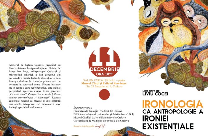 Facultatea de Teologie Ortodoxă din Craiova, în parteneriat cu Biblioteca Județeană „Alexandru și Aristia Aman” Dolj, cu Universitatea de Medicină și Farmacie din Craiova și cu Muzeul Cărții și Exilului Românesc, organizează luni, 11 decembrie, începând cu ora 18, la Salonul expozițional – parter, Muzeul Cărții și Exilului din Craiova, cea de a treia conferință a Atelierului Synaxis, intitulată „Ironologia ca antropologie a ironiei existențiale”. Prelegerea va fi susținută de lect. univ. dr. Liviu Iulian Cocei, cadru didactic la Facultatea de Istorie, Filosofie și Teologie a Universității „Dunărea de Jos”…