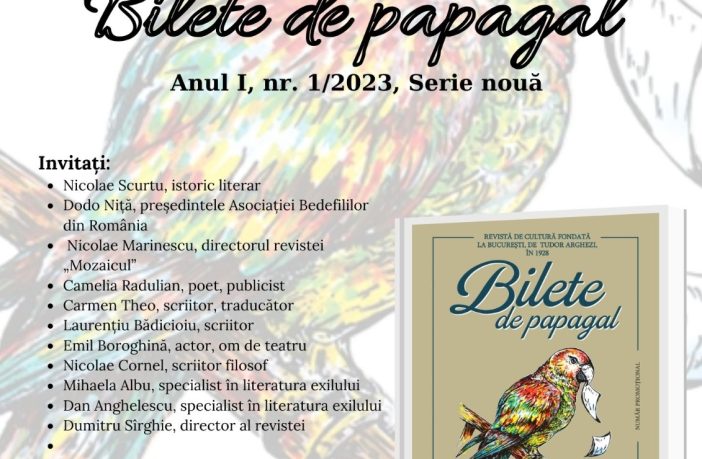 Biblioteca Județeană „Alexandru și Aristia Aman” găzduiește vineri, 17 noiembrie 2023, începând cu ora 13.00, lansarea revistei „Bilete de papagal”, Anul I, nr. 1/2023, Serie nouă, apărută la Editura „Arena Artelor” din Slatina. Dintre invitații speciali care vor lua cuvântul la această manifestare de restituire a revistei „Bilete de papagal” amintim pe: Nicolae Scurtu, istoric literar, Dodo Niță, președintele Asociației Bedefililor din România, Nicolae Marinescu, directorul revistei „Mozaicul”, Camelia Radulian, poet, publicist, Carmen Theo, scriitor, traducător, Laurențiu Bădicioiu, scriitor, organizatorul Festivalului de umor și poezie „Romeo și Jullieta la Mizil”, Emil…