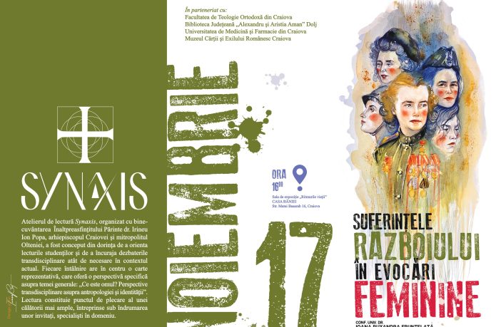 Facultatea de Teologie Ortodoxă din Craiova, în parteneriat cu Biblioteca Județeană „Alexandru și Aristia Aman” Dolj, cu Universitatea de Medicină și Farmacie din Craiova și cu Muzeul Olteniei, organizează vineri, 17 noiembrie a.c., începând cu ora 16, la Sala de expoziție „Ritmurile vieții” – Casa Băniei din Craiova, cea de-a doua conferință a Atelierul Synaxis, intitulată „Suferințele războiului în evocări feminine”. Prelegerea va fi susținută de conf. univ. dr. Ioana-Ruxandra Fruntelată, cadru didactic la Facultatea de Litere a Universității din București și CS II la Institutul de Etnografie și Folclor…