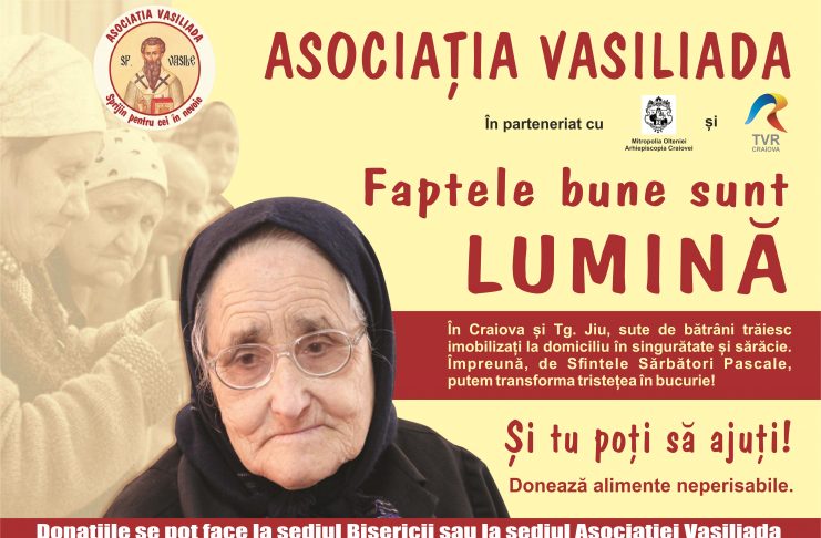În cadrul campaniei „Faptele Bune sunt Lumină”, toți cei interesați să ofere ajutor bătrânilor imobilizați la domiciliu, care trăiesc în singurătate și sărăcie, sunt îndemnați să doneze la bisericile din Craiova și Târgu Jiu alimente neperisabile precum: ulei, zahăr, făină, conserve, fasole, paste făinoase etc. Donațiile se pot face, de asemenea, la sediul Asociației Vasiliada, din strada Frații Buzești nr. 20, Craiova, iar informații suplimentare pot fi oferite la numărul de telefon 0251.521.040. Donațiile vor fi colectate de la fiecare biserică, în Săptămâna Patimilor, de asistenții sociali ai Asociației Vasiliada,…