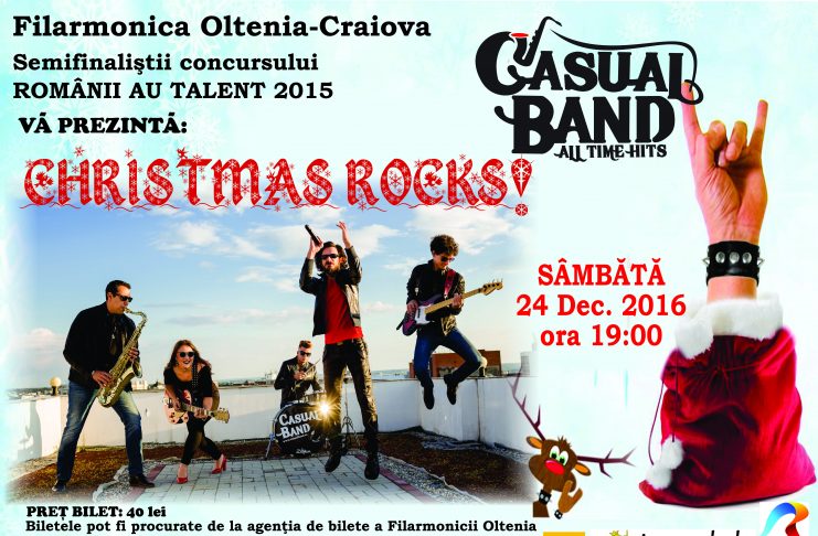 Ne revedem şi anul acesta cu un eveniment special de Crăciun! După succesul spectacolului de anul trecut, care a fost în două rânduri sold out, vă dăm întâlnire la Filarmonica OLTENIA pe 24 decembrie, ora 19.00, pentru a asculta cele mai îndrăgite colinde americane şi, în premieră, hituri rock de referinţă! Durata spectacol: 90minute Biletele se pot procura de la Agenţia Filarmonicii, preţ bilet: 40lei