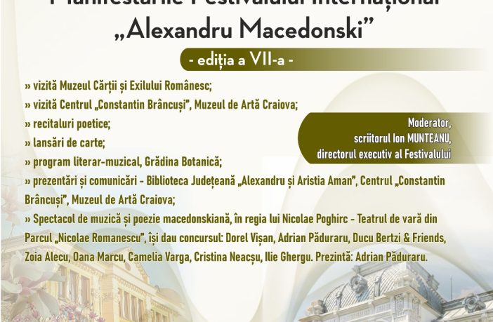 La Craiova, în perioada 22 – 24 mai 2025, sub egida Consiliului Județean Dolj, Biblioteca Județeană „Alexandru și Aristia Aman”, în parteneriat cu Muzeul Cărții și Exilului Românesc, Muzeul de Artă, Centrul Național „Constantin Brâncuși”, Compartimentul Casei de cultură „Traian Demetrescu” al Teatrului Colibri, Teatrul Național „Marin Sorescu” și Asociația Culturală „Alexandru Macedonski”, organizează cea de-a VII-a ediție a Festivalului Internațional „Alexandru Macedonski”. «De ce îl sărbătorim la Craiova, an de an, începând cu 2019, pe Alexandru Macedonski, poetul Nopților și al Rondelurilor, într-un eveniment cu o însemnată participare națională și…