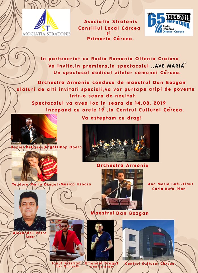 Zilele comunei Cârcea de anul acesta ne aduc muzică pentru suflet! Asociația Stratonis-filiala Oltenia, Consiliul local și Primăria Cârcea in parteneriat cu Radio România Oltenia Craiova ne propun o altfel de petrecere. A sufletului!