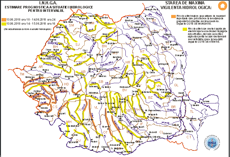 Institutul Național de Hidrologie și Gospodărire a Apelor a emis o avertizare de Cod Galben pentru următoarele bazine hidrografice afectate: Vişeu, Iza, Tur, Someș, Crasna, Barcău, Crişul Repede, Crişul Negru, Crişul Alb, Mureş, Bega Veche, Bega, Timiş, Bârzava, Moraviţa, Caraş, Nera, Cerna, Drincea, Desnăţui, Jiu, Olt, Vedea, Argeş, Ialomiţa, Buzău, Trotuş, Putna, Rm. Sărat. Codul este valabil până pe 15 iunie la orele 16,00. Sunt vizate scurgeri importante pe versanţi, torenţi şi pâraie, viituri rapide pe râurile mici cu posibile efecte de inundaţii locale şi creşteri de debite şi niveluri pe unele râuri din bazinele hidrografice menţionate, cu depăşiri ale COTELOR DE APĂRARE.