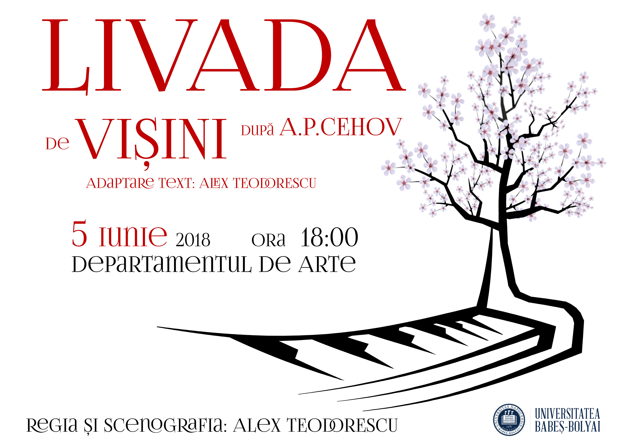 Produsul de divertisment cultural final: „Livada de vişini”, după A.P. Cehov, un text dramatizat şi pus în scenă de tânărul regizor Alexandru Teodorescu, student anul III al Facultăţii de Teatru şi Televiziune din Cluj Napoca, din cadrul Universităţii Babeş Bolyai, specializarea „” Artele Spectacolului” , Regie, clasa Conf. Univ. dr. Gelu Badea, va fi prezentat în faţa publicului în data de 5 iunie 2018, ora 18.00, la sediul Departamentului de Arte (sala de balet).