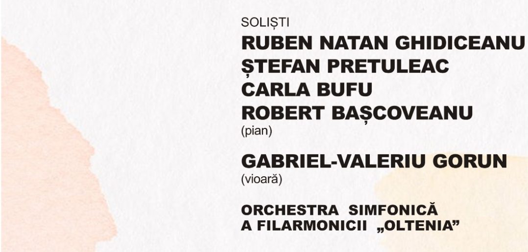Sub bagheta apreciatului dirijor GHEORGHE COSTIN, acest concert va aduce în prim plan tineri soliști talentați: RUBEN NATAN GHIDICEANU, ȘTEFAN PRETULEAC, CARLA BUFU și ROBERT BAȘCOVEANU, la pian, alături de GABRIEL-VALERIU GORUN, la vioară.