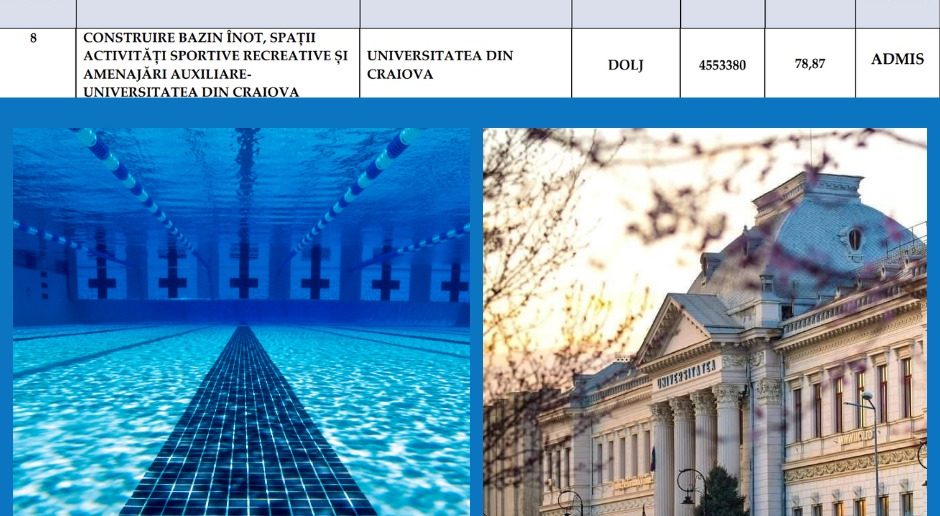 Proiectul Universității din Craiova „Construire bazin înot, spații activități sportive recreative și amenajări auxiliare” primește finanțare de la Ministerul Educației prin Planul Național de Redresare și Reziliență.