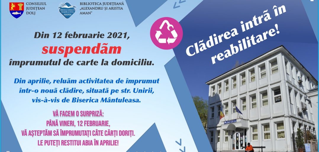 Tot vineri, 12 februarie 2021, va fi inițiat procesul de organizare în cutii a tuturor cărților deținute la nivelul secțiilor de împrumut, în vederea mutării acestora într-o altă locație. Până la finalizarea lucrărilor de reabilitare, activitatea de împrumut de carte la domiciliu se va desfășura în imobilul situat în Craiova, pe strada Unirii, vis-a-vis de Biserica „Mântuleasa”.