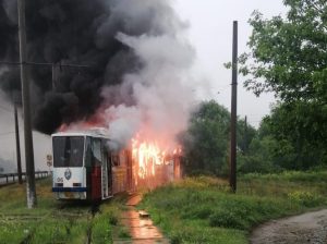 Un tramvai a luat foc după ce un trăsnet l-a lovit în plin. Din fericire, în mijlocul de transport nu se aflau călători, acesta aflându-se în bucla de la CLF pentru a întoarce. La fața locului au ajuns pompierii de la Detașamentul 1 cu o autospecială de stingere cu apă și spumă. În urma incendiului au ars materiale combustibile din componenta tramvaiului in proportie de 70% . Cauza de probabaila a incendiului a fost stabilita ca fiind un scurtcircuit electric.