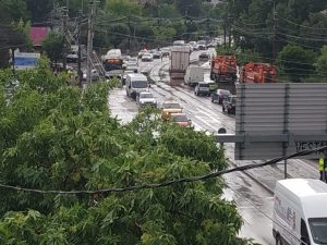 Precipitațiile căzute în urmă cu puțin timp au inundat mai multe străzi, autoturismele au rămas blocate în apă iar un tramvai a fost lovit de trăsnet.