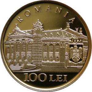 Aversul monedei redă clădirea Teatrului Național din Iași, la începutul secolului al XX-lea, inscripția în arc de cerc „ROMANIA”, anul de emisiune „2021”, stema României și valoarea nominală „100 LEI”.