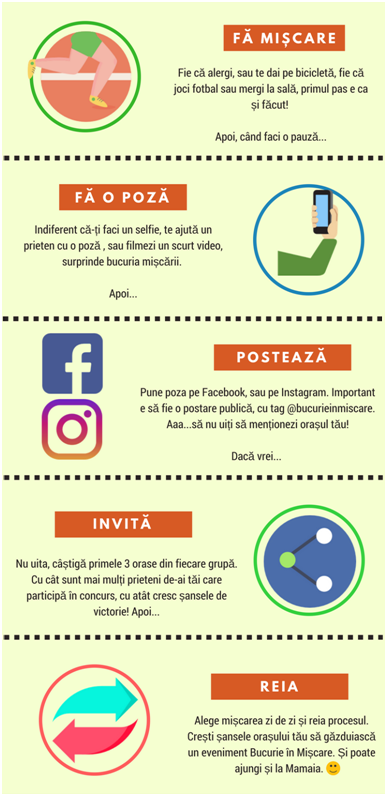 Concursul online Alege mișcarea azi” care reprezintă prima etapă a proiectului, se desfășură în perioada1-15 martie 2018 pe canalele Facebook și Instagram.