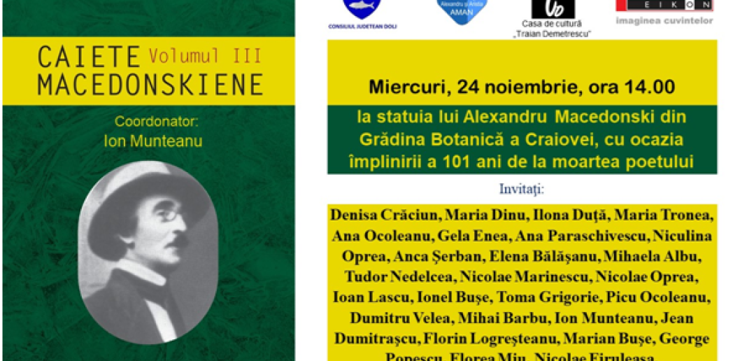 Consiliul judeţean Dolj şi Biblioteca judeţeană „Alexandru şi Aristia Aman”, în colaborare cu Filiala Craiova a Uniunii Scriitorilor din România şi Casa de cultură „Traian Demetrescu” organizează miercuri, 24 noiembrie 2021, ora 14, la statuia lui Alexandru Macedonski din Grădina Botanică, lansarea celui de-al treilea volum al Caietelor macedonskiene (coordonator: Ion Munteanu), cu ocazia împlinirii a 101 ani de la moartea poetului.