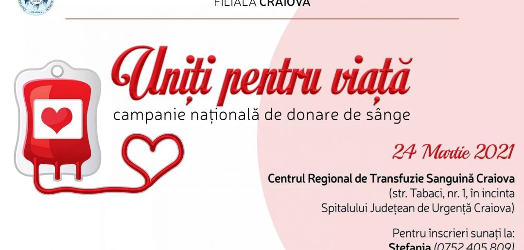 La Craiova, acţiunea se va desfăşura în data de 24 martie, la Centrul de Transfuzie Sanguină (str. Tabaci, nr.1, în incinta Spitalului Judeţean de Urgenţă, intrarea dinspre policlinică), între orele 8.00 – 13.00. Înscrierile se pot face la numerele de telefon 0752.405.809 / 0754.913.592.