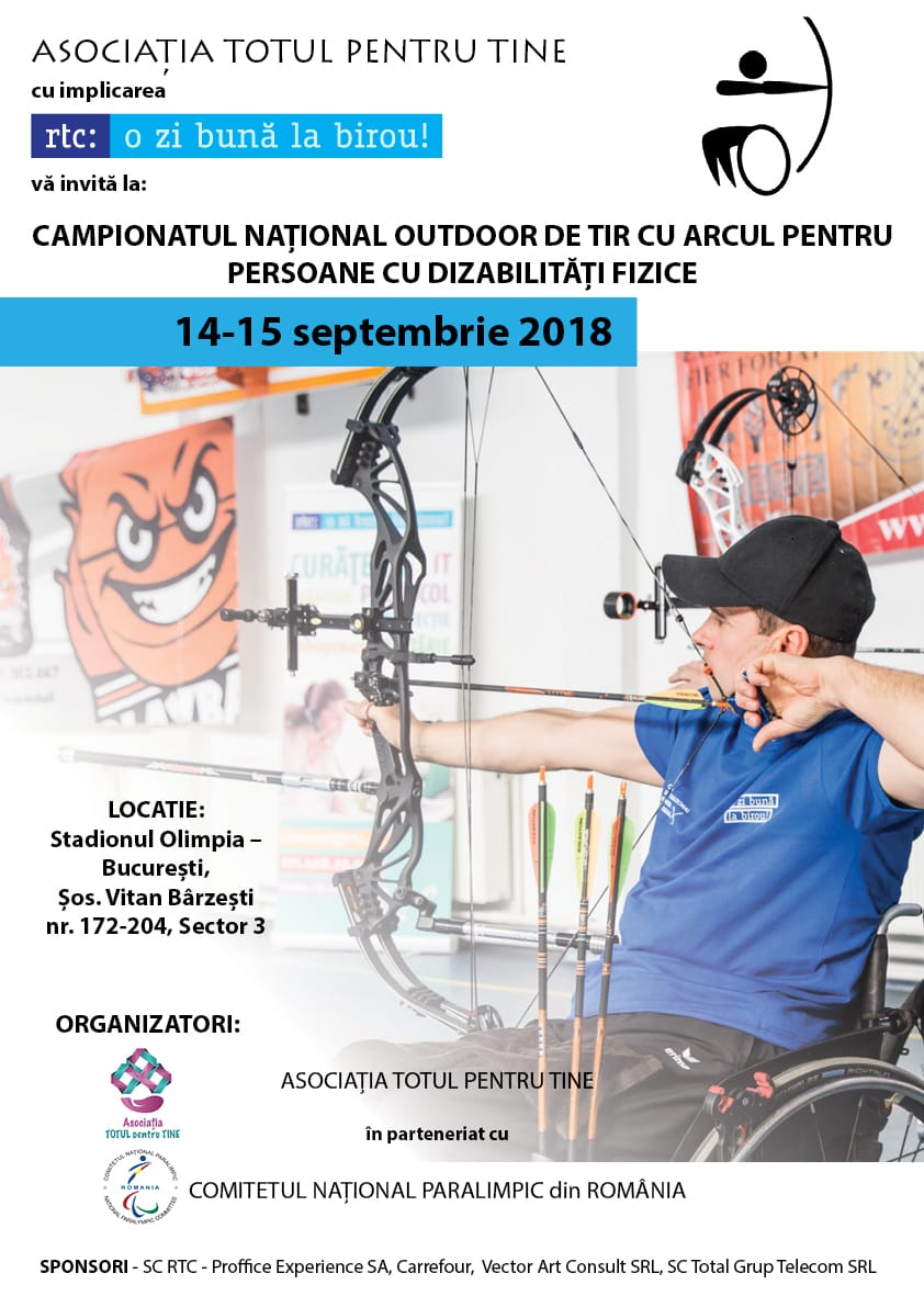 Comitetul Național Paralimpic din ROMÂNIA în parteneriat cu Asociația totul pentru tine, şi cu sprijinul Ministerului Tineretului şi Sportului, organizează în perioada 14-15 septembrie 2018 la Stadionul Olimpia din București (Calea Vitan nr. 172-204, Sector 3), Campionatul Național de Tir cu Arcul Outdoor destinat persoanelor cu dizabilități fizice.
