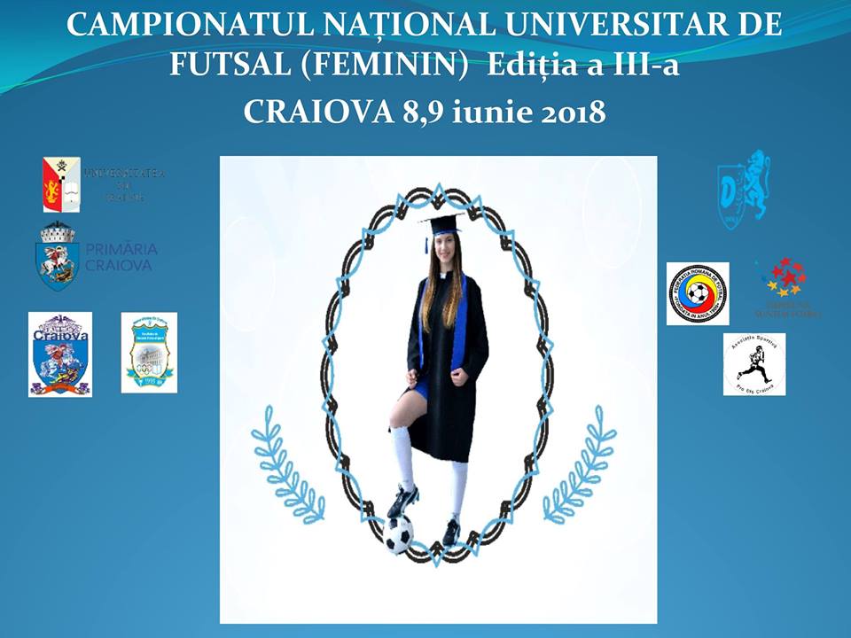 Universitatea din Craiova prin Facultatea de Educația Fizică și Sport, organizează Campionatul Național Universitar de Futsal Feminin (futsal), ediția a III-a. În deschidere, este organizată şi conferinţă de presa joi, 7.06.218, ora 11.00, la Facultatea de Educație Fizică și Sport, Aula „Corneliu Andrei Stroe”.