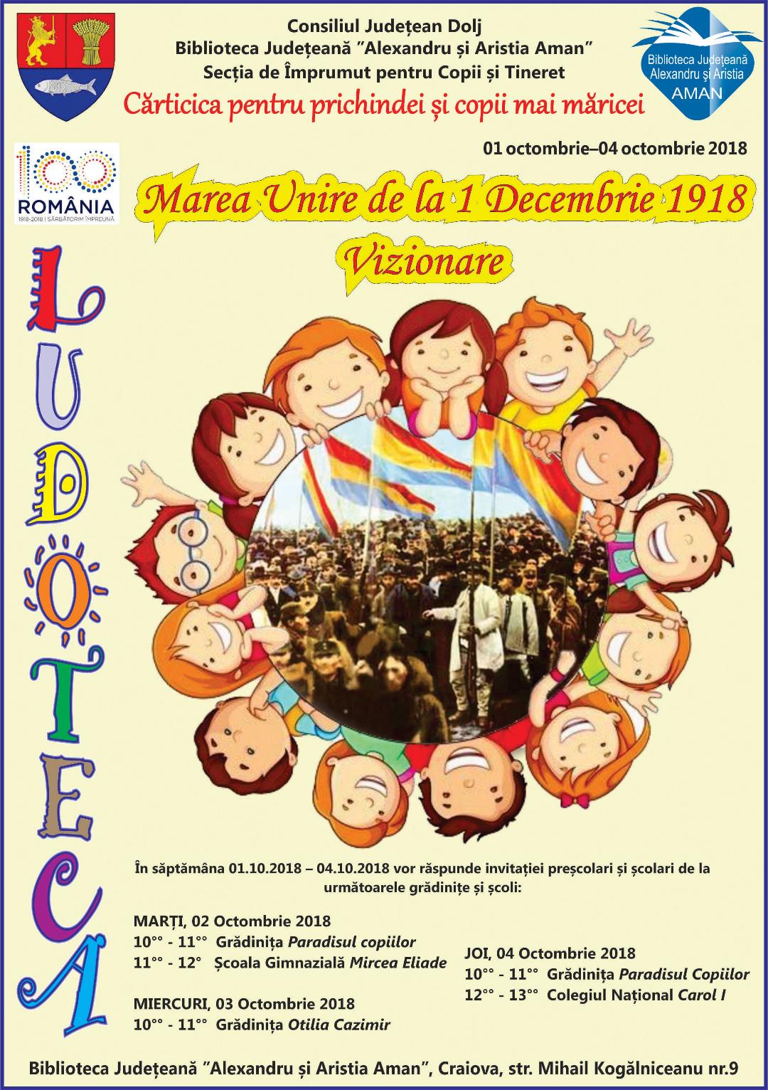 Biblioteca Județeană „Alexandru și AristiaAman” organizează, în perioada 2– 4octombrie 2018, în cadrul proiectului “Cărticica pentru prichindei și copii mai măricei”, manifestarea cu tema Marea Unire de la 1 Decembrie 1918 – vizionare.
