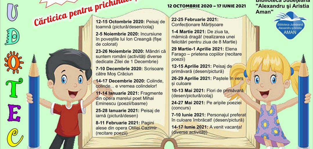 Biblioteca Județeană „Alexandru și Aristia Aman” anunță lansarea celei de-a XI-a ediții a proiectului „Cărticica pentru prichindei și copii mai măricei”. Proiectul se adresează preșcolarilor și elevilor, clasele I-IV. Din motive obiective, toate activitățile proiectului se vor desfășura în mediul online. Structurată în șaptesprezece teme educaționale, ediția de față debutează luni, 12 octombrie 2020, și se desfășoară până joi, 17 iunie 2021.
